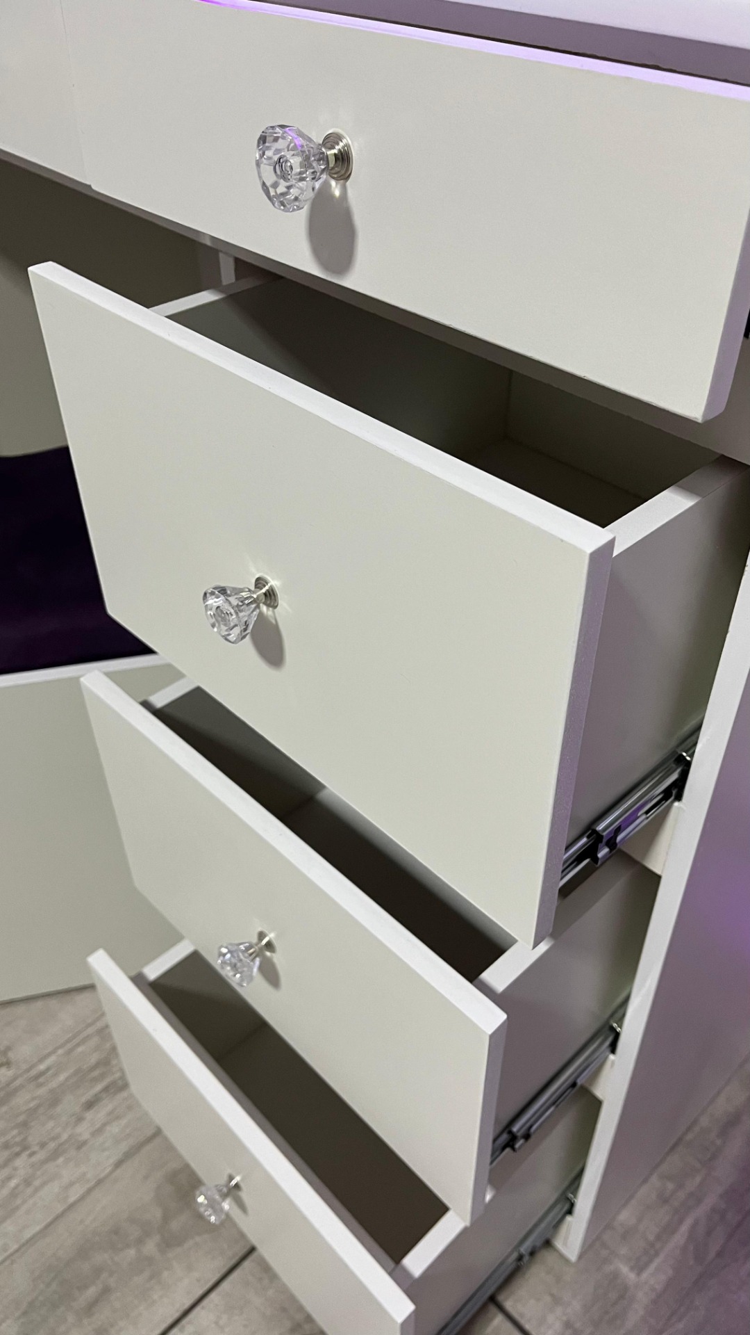 Este maquillador al ser PREMIUM cuenta con los cajones en color blanco en todas sus caras. Es fácil de limpiar y la madera al ser laminada tiene una mayor durabilidad.